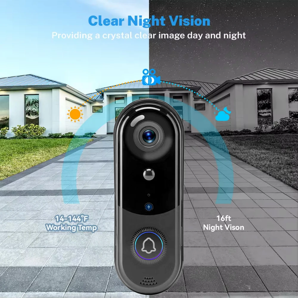 Video doorbell camera uses a 1080P full HD lens, providing you with high-definition images both day and night. The 120° wide-angle lens of the video doorbell camera allows you to clearly see the guests at the door.
