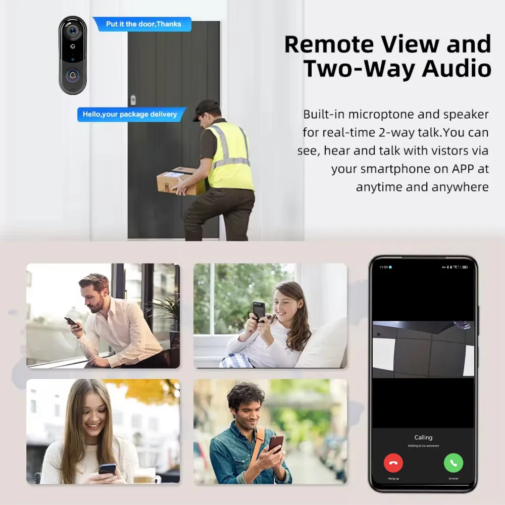 Video doorbell camera utilizes a cutting-edge AI motion detection sensor that accurately identifies humans and filters out invalid information such as vehicles, animals, and leaves. It records video footage of visitors at the door and sends notification messages to your phone.